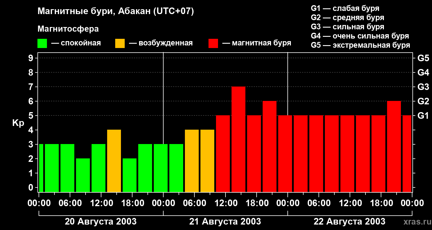 Изменения геомагнитного индекса Kp с 20 по 22 августа 2003 года для средних широт