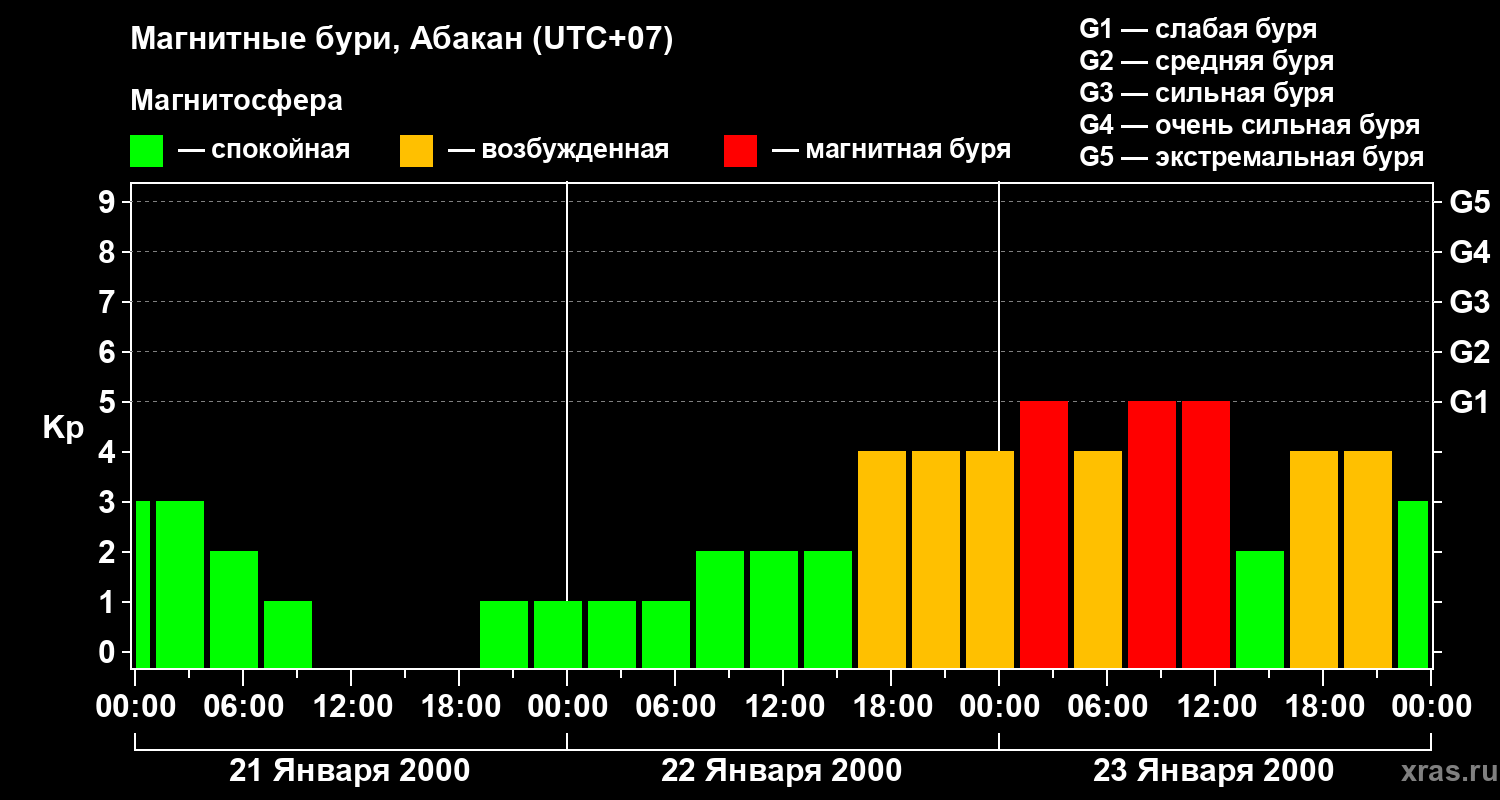 Изменения геомагнитного индекса Kp с 21 по 23 января 2000 года для средних широт