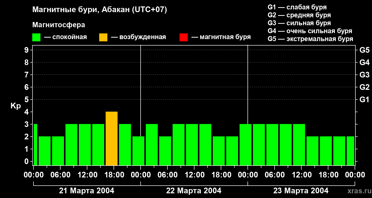 Изменения геомагнитного индекса Kp с 21 по 23 марта 2004 года для средних широт