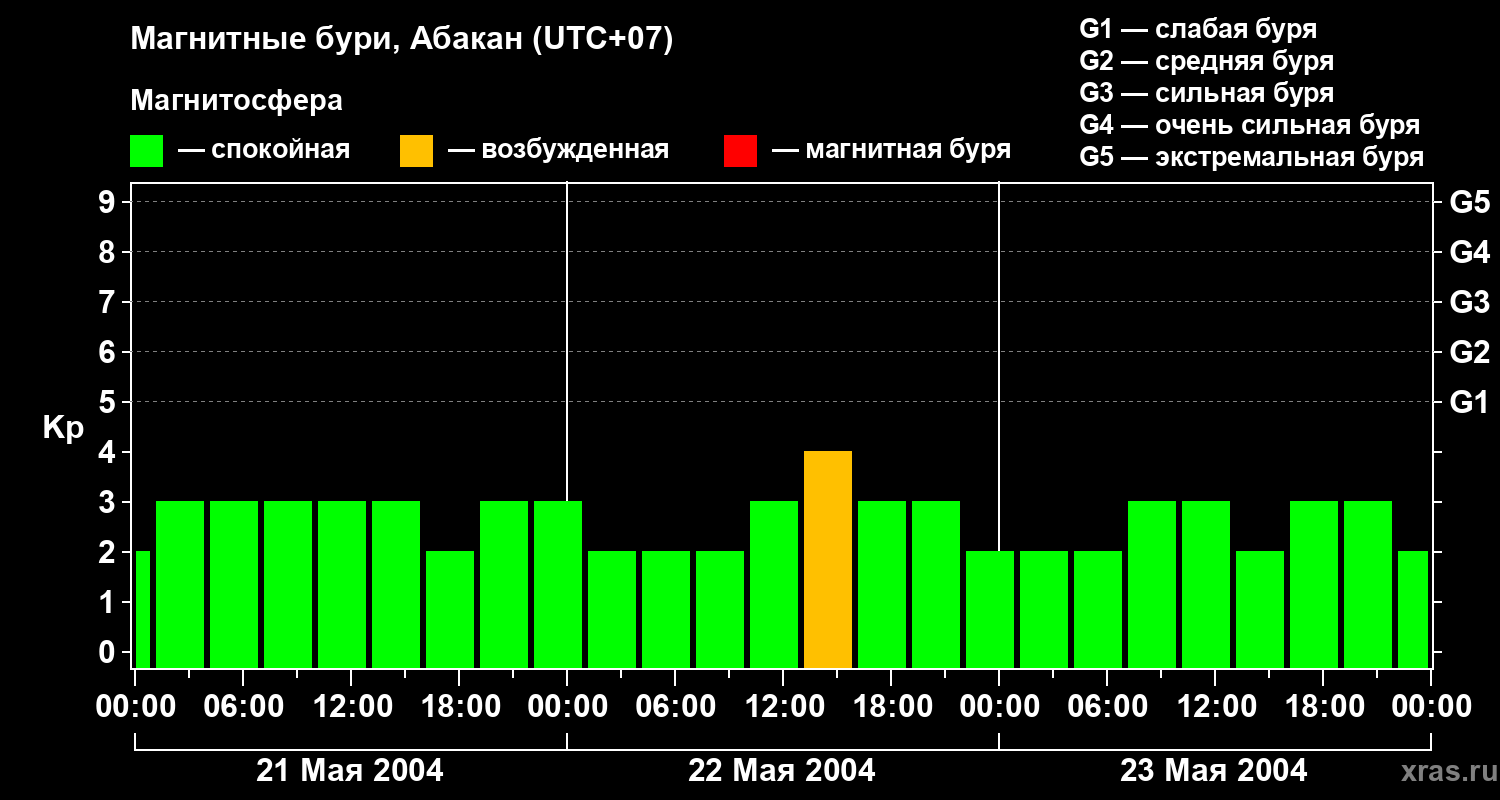 Изменения геомагнитного индекса Kp с 21 по 23 мая 2004 года для средних широт