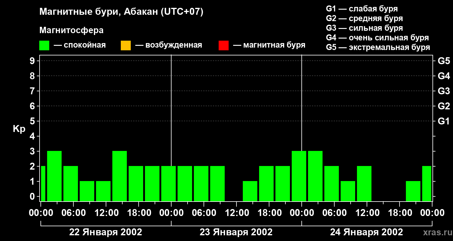 Изменения геомагнитного индекса Kp с 22 по 24 января 2002 года для средних широт