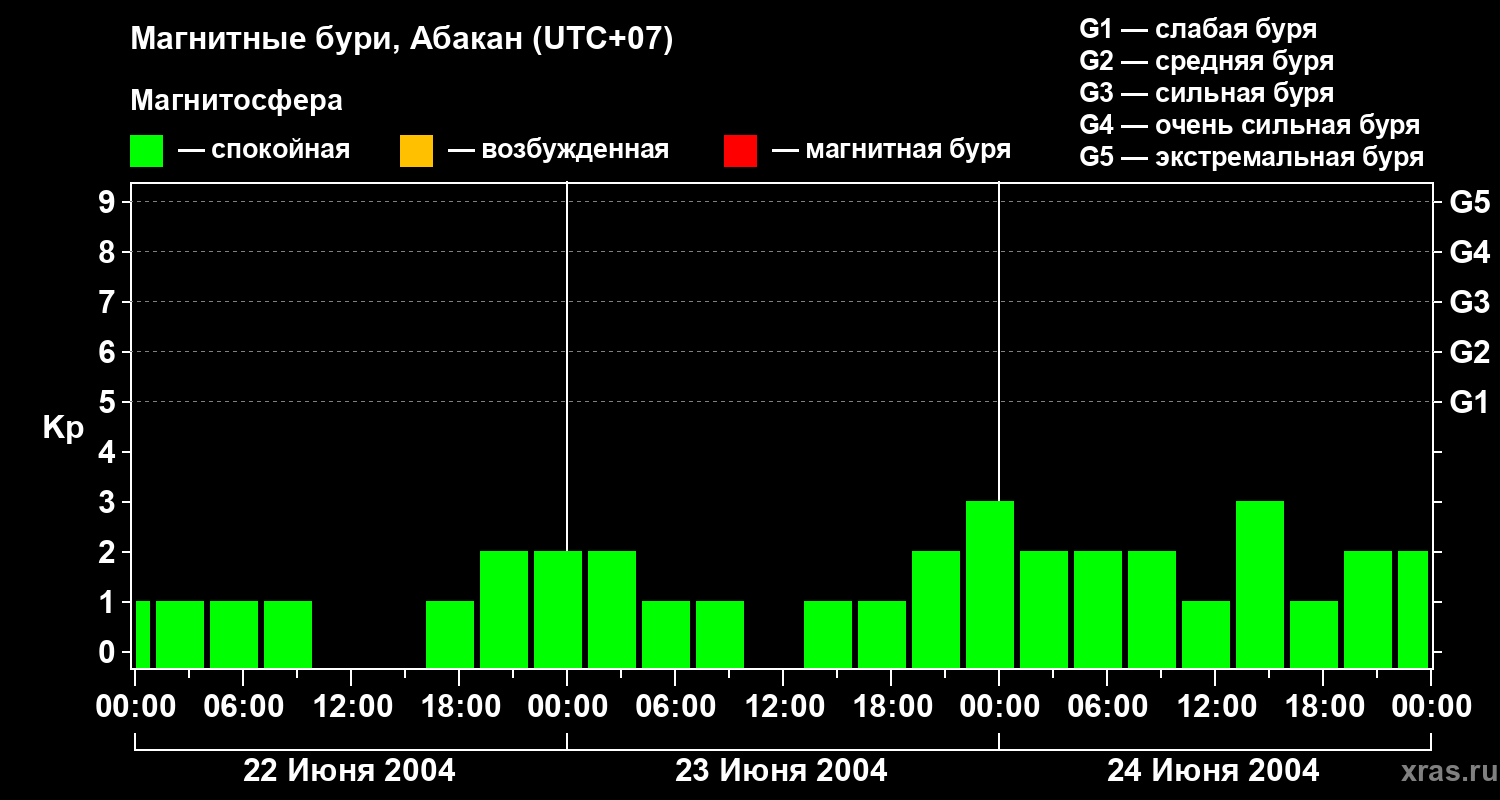 Изменения геомагнитного индекса Kp с 22 по 24 июня 2004 года для средних широт