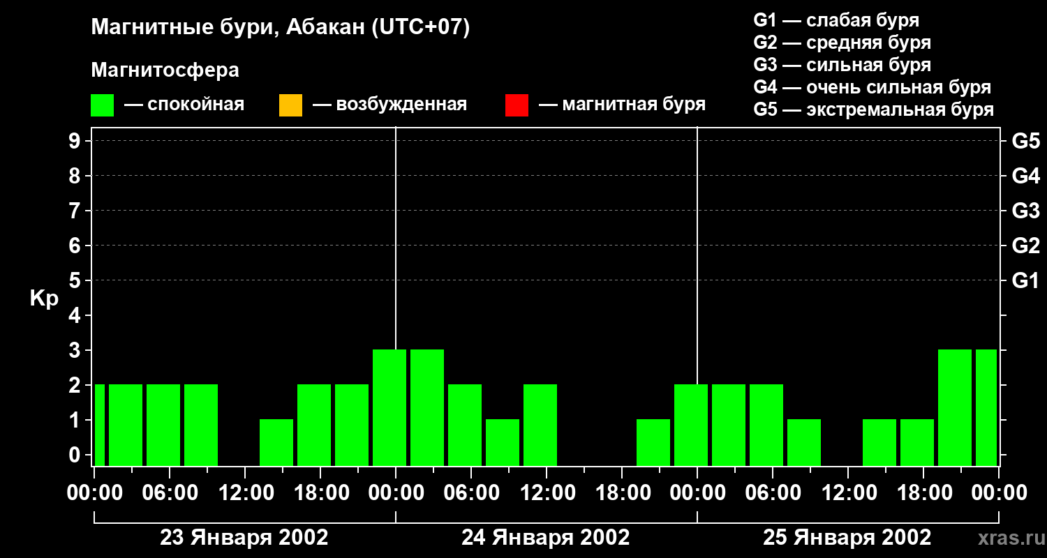 Изменения геомагнитного индекса Kp с 23 по 25 января 2002 года для средних широт