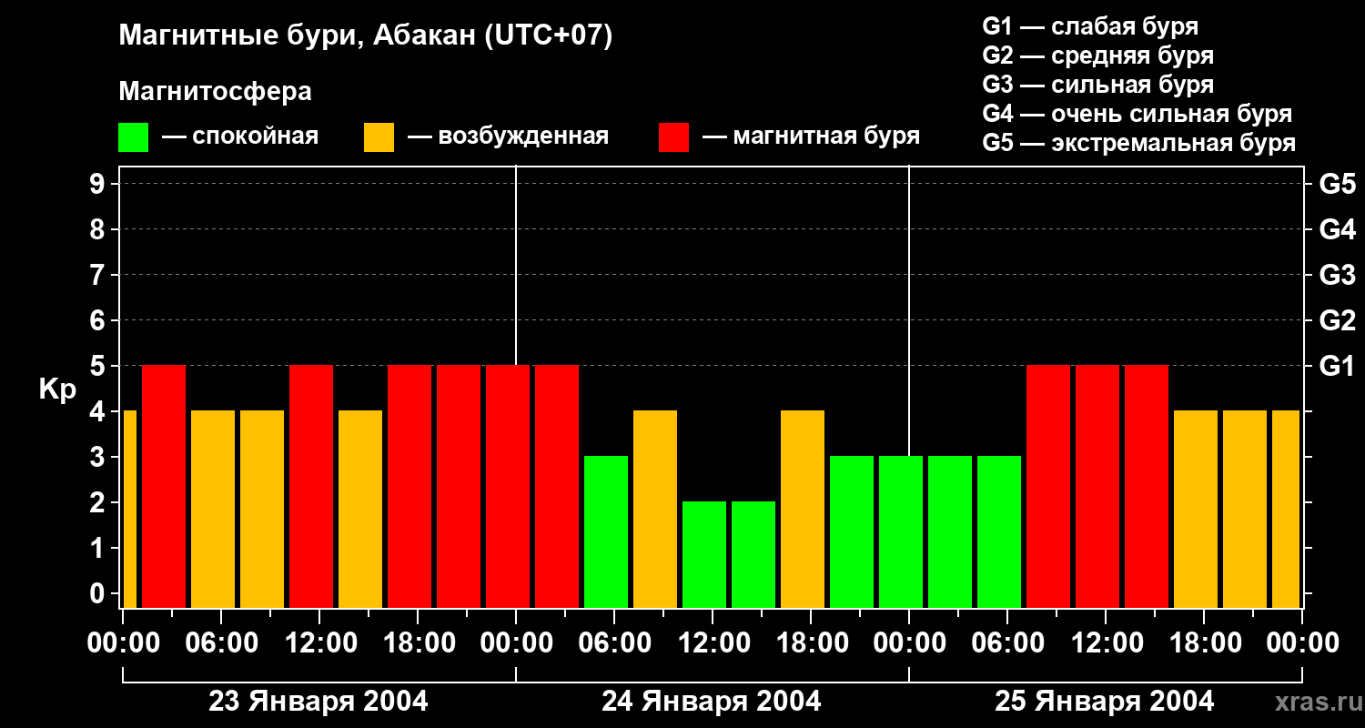 Изменения геомагнитного индекса Kp с 23 по 25 января 2004 года для средних широт