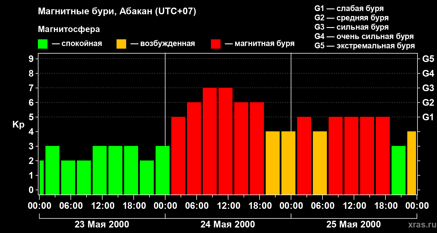 Изменения геомагнитного индекса Kp с 23 по 25 мая 2000 года для средних широт