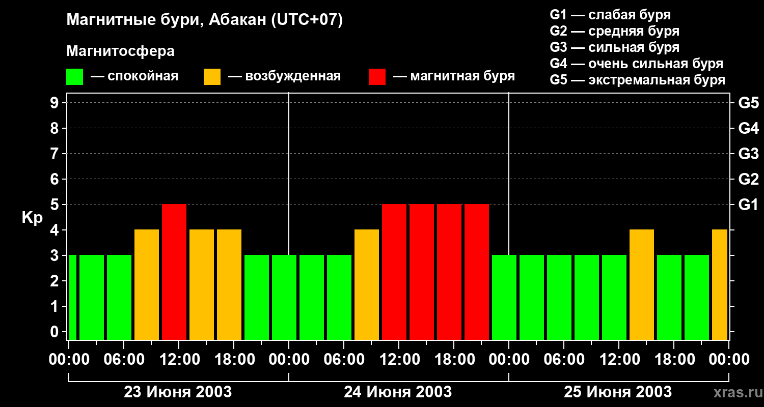 Изменения геомагнитного индекса Kp с 23 по 25 июня 2003 года для средних широт