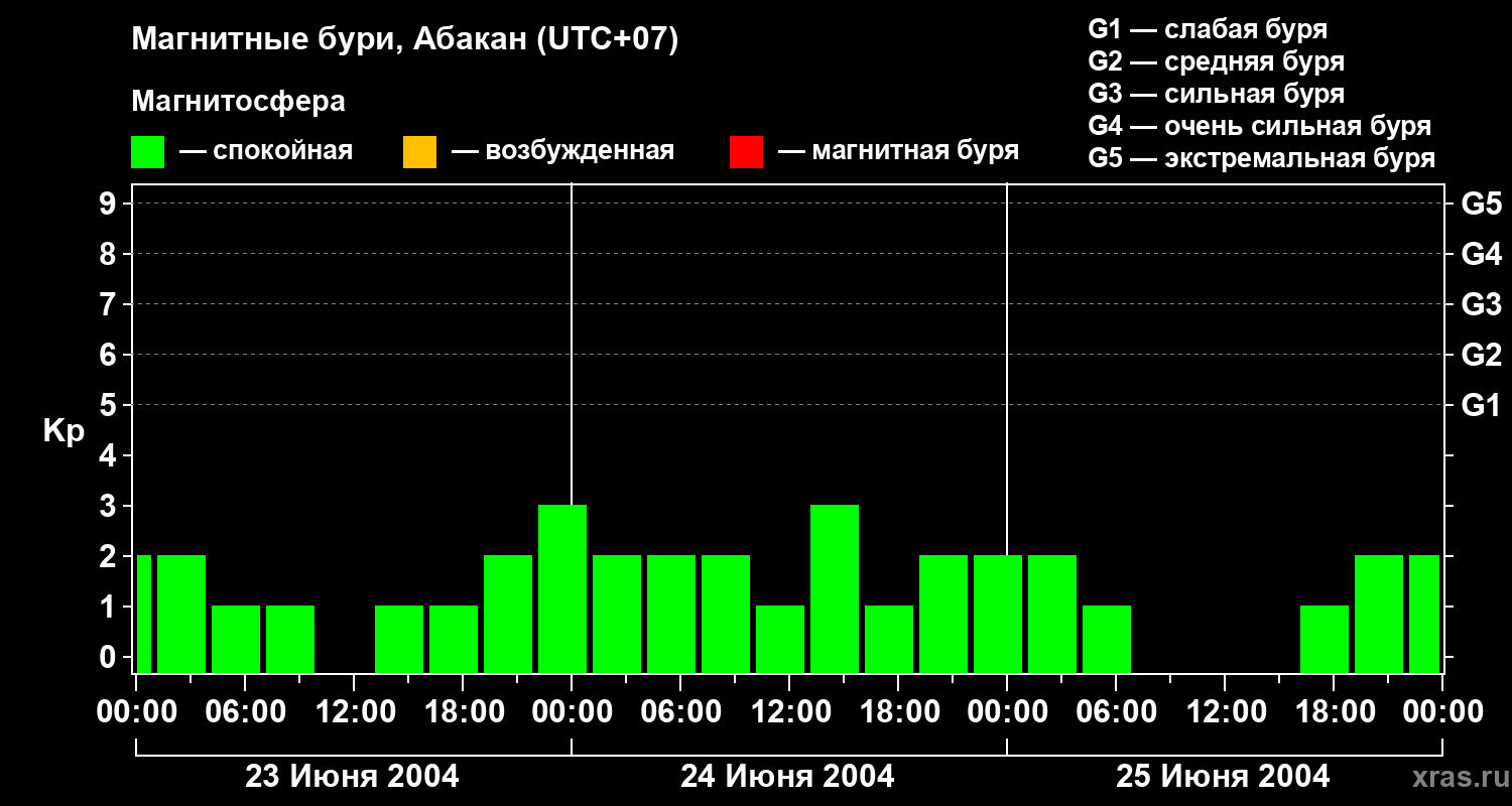 Изменения геомагнитного индекса Kp с 23 по 25 июня 2004 года для средних широт