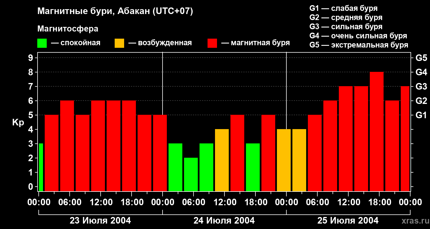 Изменения геомагнитного индекса Kp с 23 по 25 июля 2004 года для средних широт