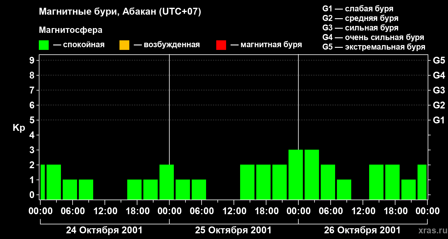 Изменения геомагнитного индекса Kp с 24 по 26 октября 2001 года для средних широт