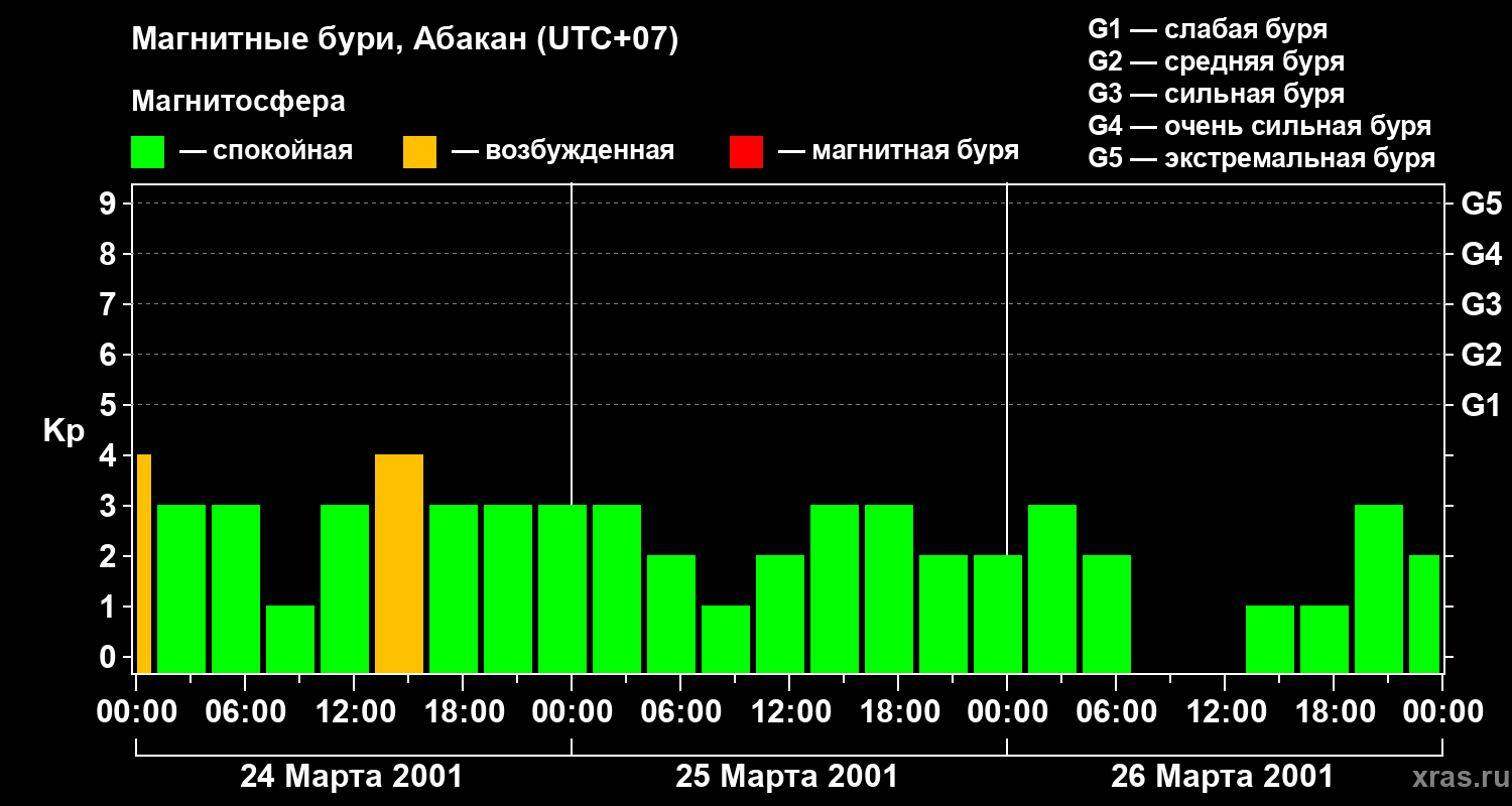 Изменения геомагнитного индекса Kp с 24 по 26 марта 2001 года для средних широт