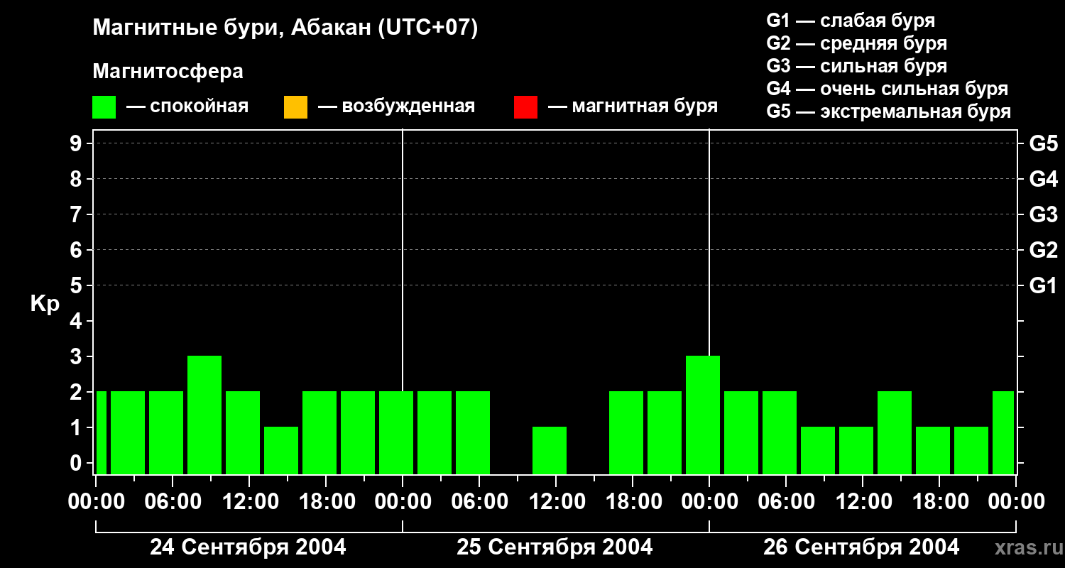 Изменения геомагнитного индекса Kp с 24 по 26 сентября 2004 года для средних широт
