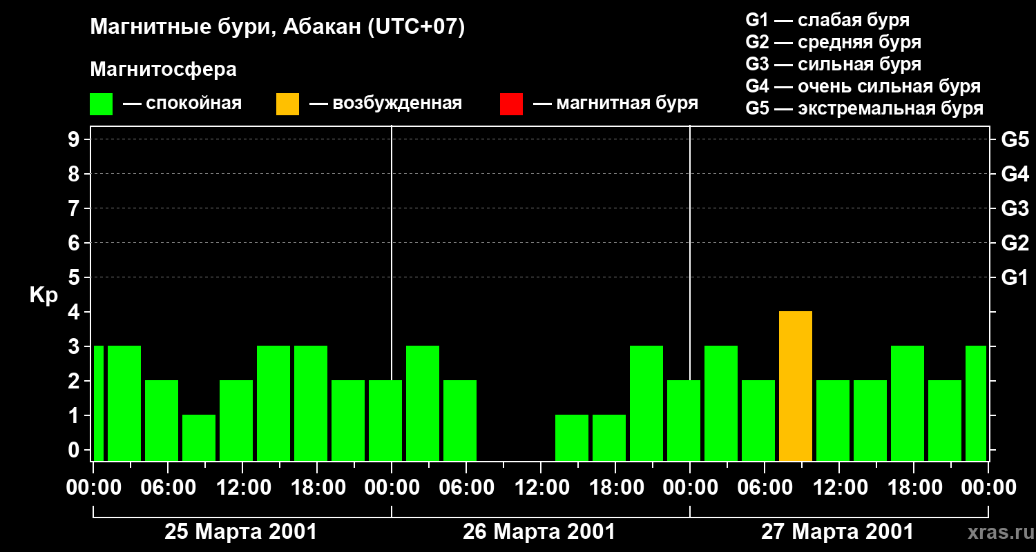 Изменения геомагнитного индекса Kp с 25 по 27 марта 2001 года для средних широт
