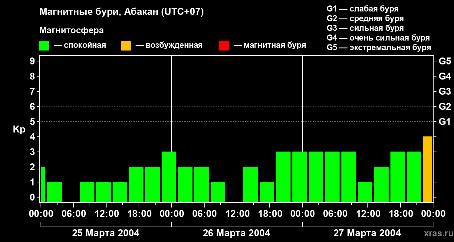 Изменения геомагнитного индекса Kp с 25 по 27 марта 2004 года для средних широт