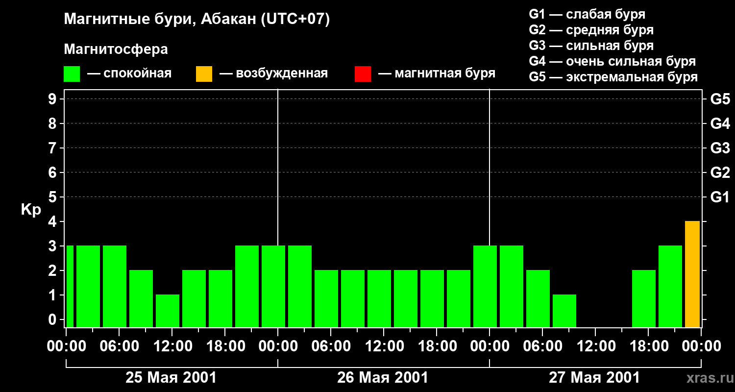 Изменения геомагнитного индекса Kp с 25 по 27 мая 2001 года для средних широт