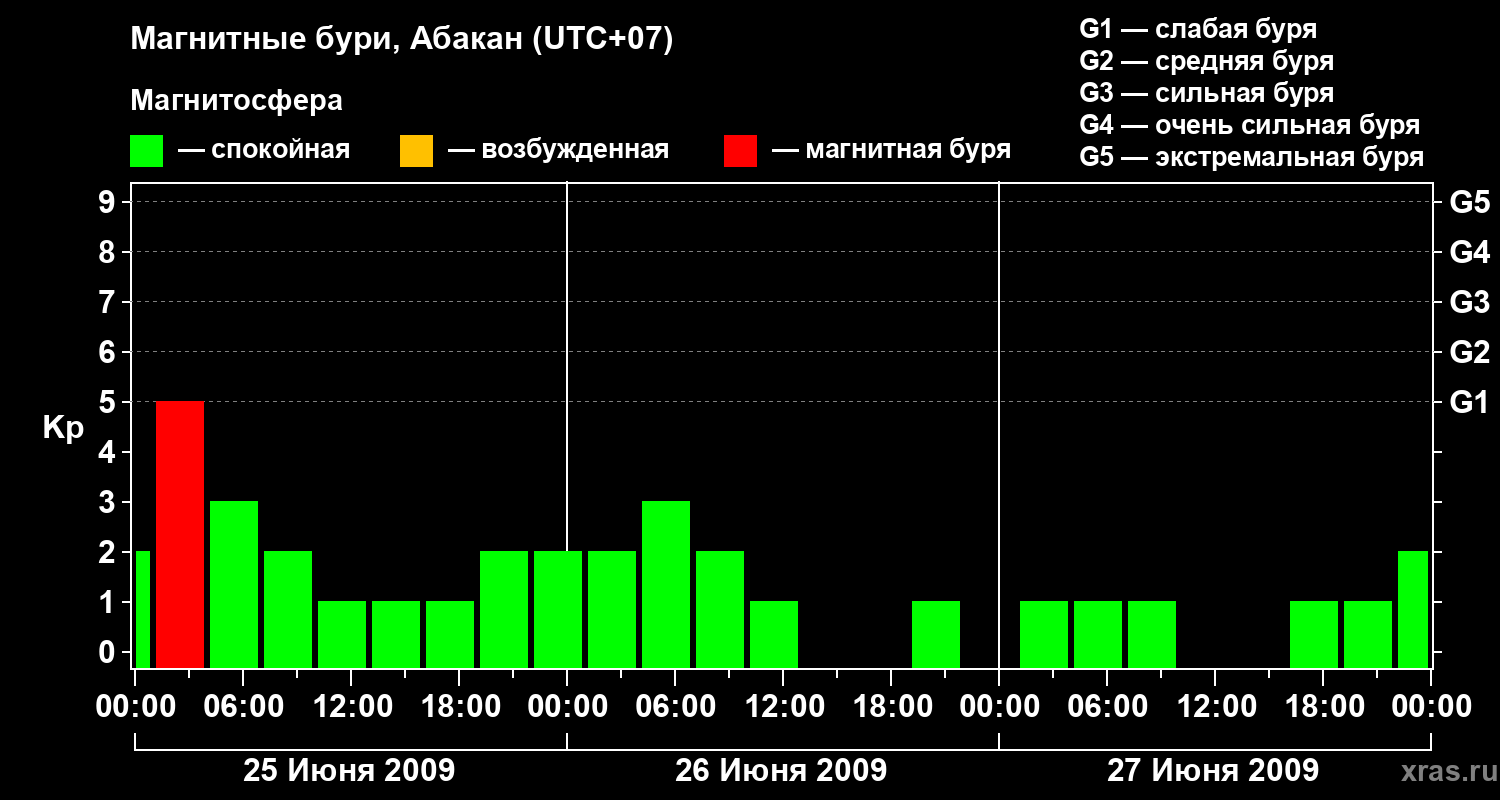 Изменения геомагнитного индекса Kp с 25 по 27 июня 2009 года для средних широт