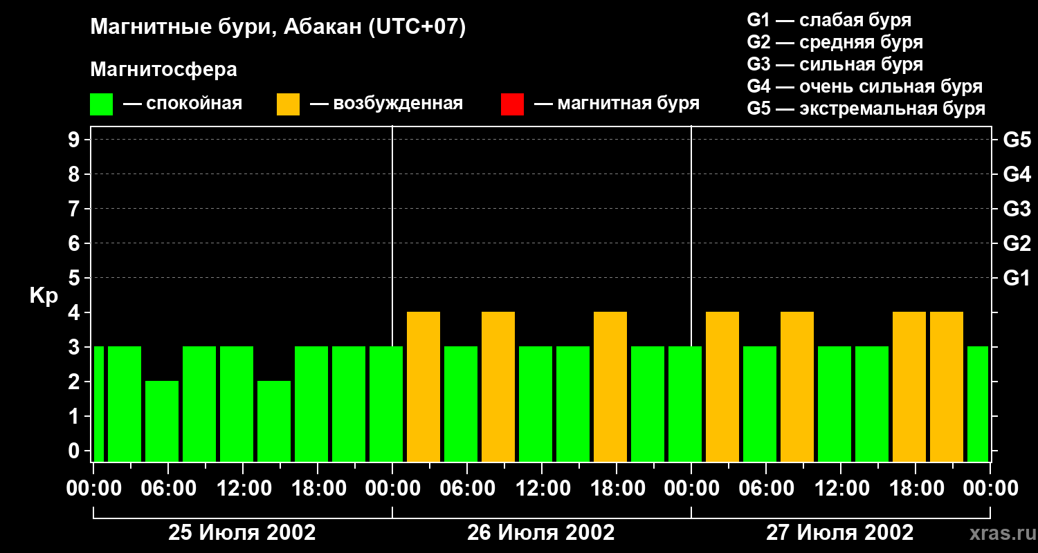 Изменения геомагнитного индекса Kp с 25 по 27 июля 2002 года для средних широт