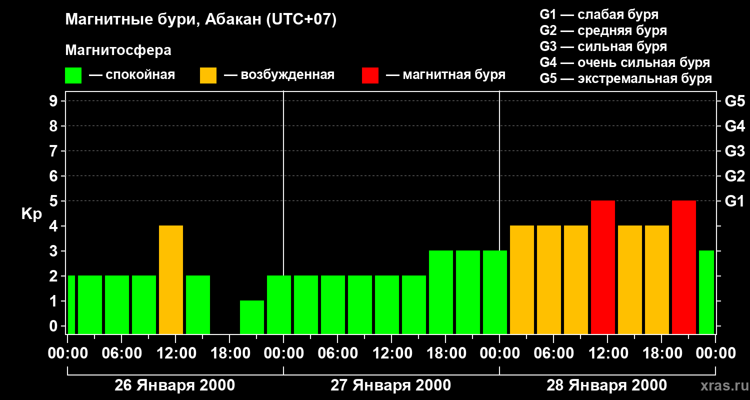 Изменения геомагнитного индекса Kp с 26 по 28 января 2000 года для средних широт