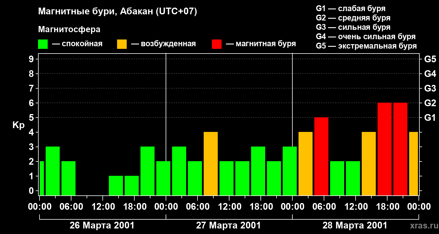 Изменения геомагнитного индекса Kp с 26 по 28 марта 2001 года для средних широт