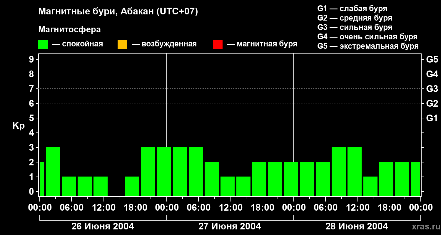 Изменения геомагнитного индекса Kp с 26 по 28 июня 2004 года для средних широт