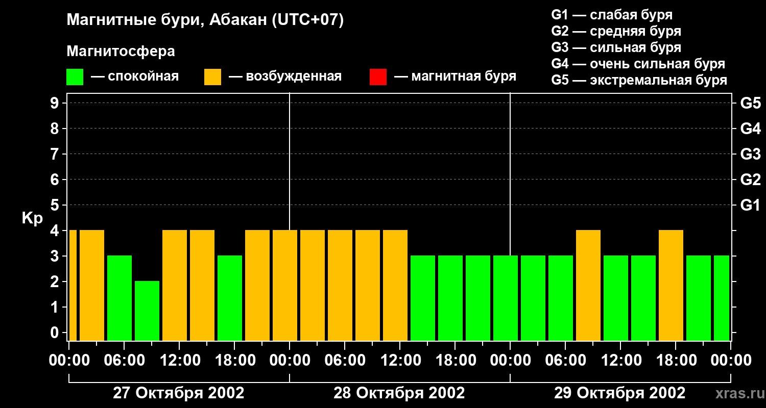Изменения геомагнитного индекса Kp с 27 по 29 октября 2002 года для средних широт