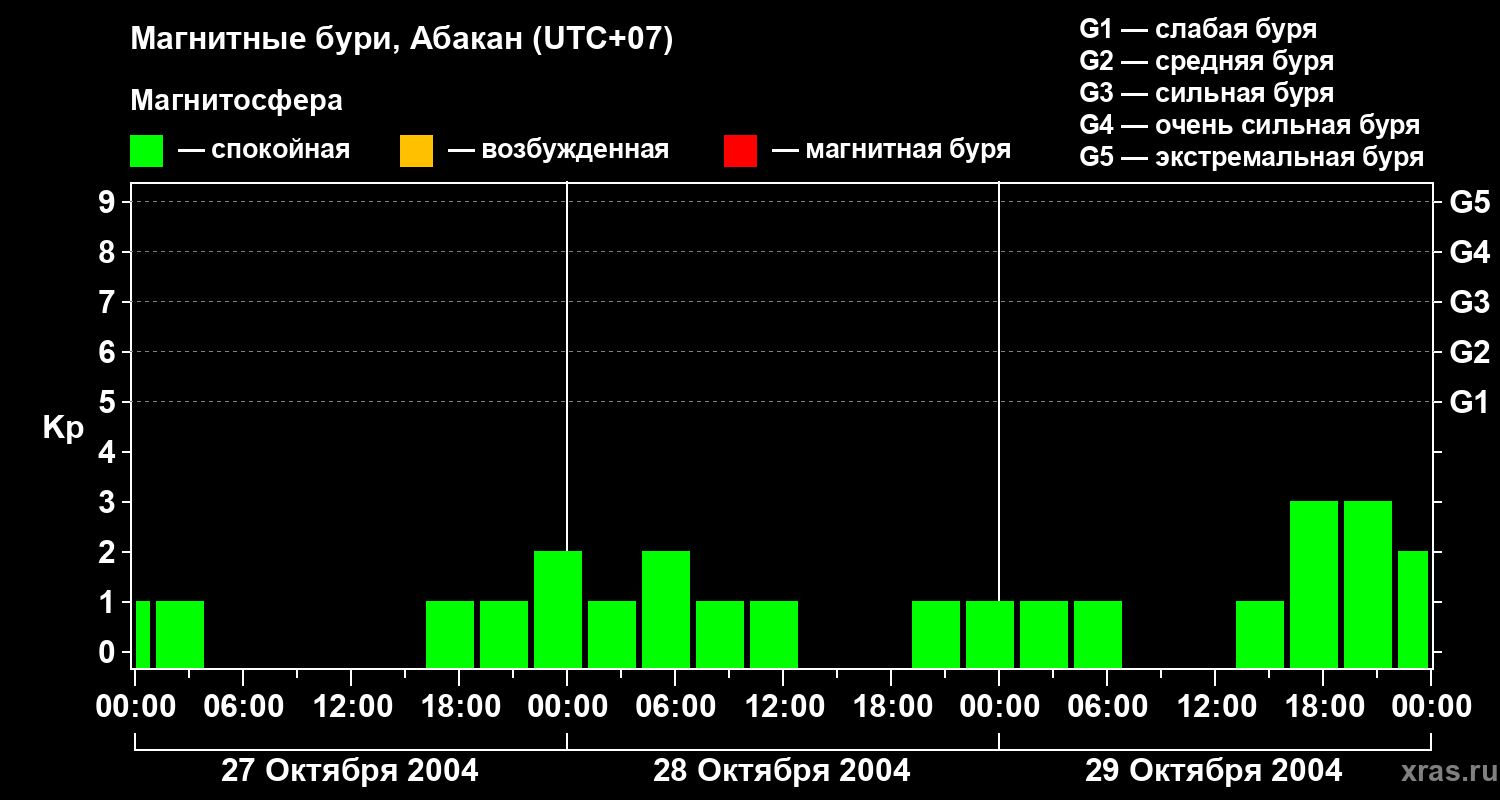 Изменения геомагнитного индекса Kp с 27 по 29 октября 2004 года для средних широт