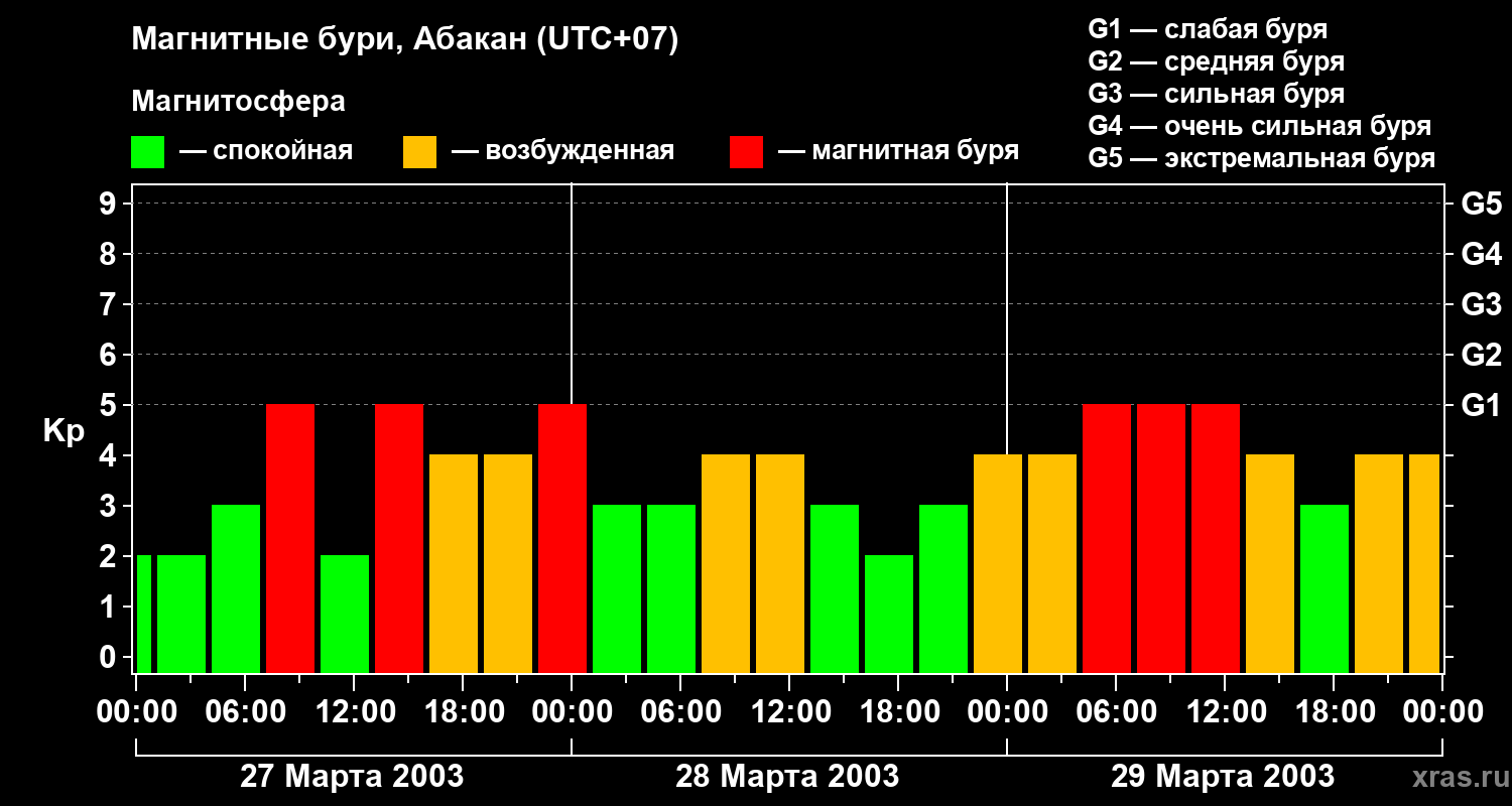 Изменения геомагнитного индекса Kp с 27 по 29 марта 2003 года для средних широт