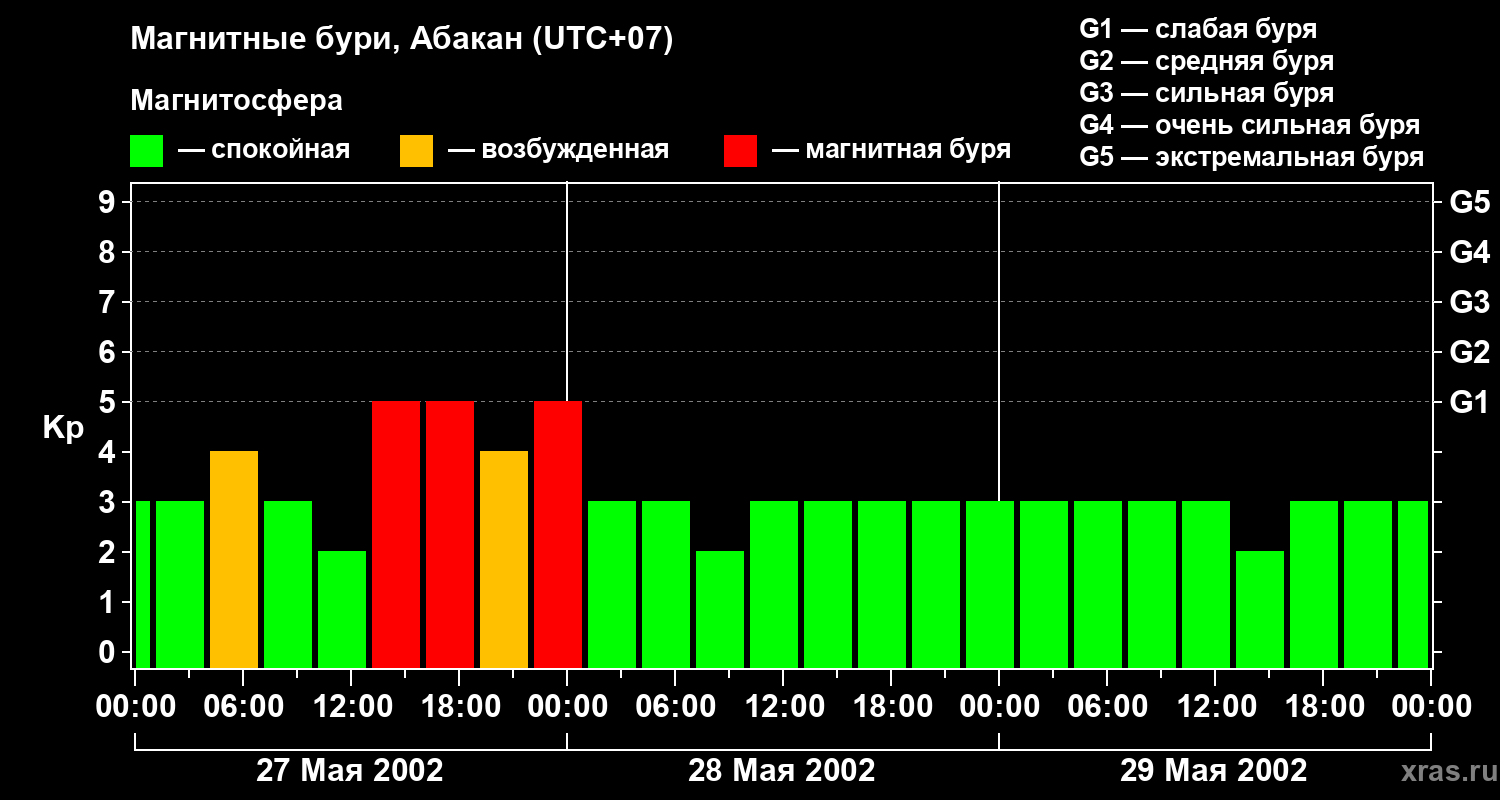 Изменения геомагнитного индекса Kp с 27 по 29 мая 2002 года для средних широт