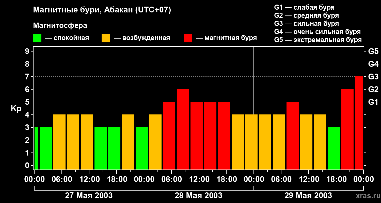 Изменения геомагнитного индекса Kp с 27 по 29 мая 2003 года для средних широт