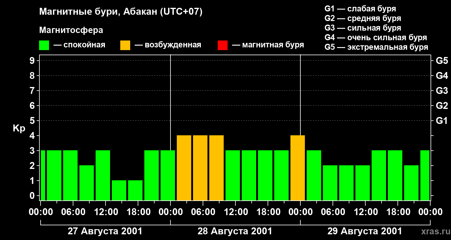 Изменения геомагнитного индекса Kp с 27 по 29 августа 2001 года для средних широт