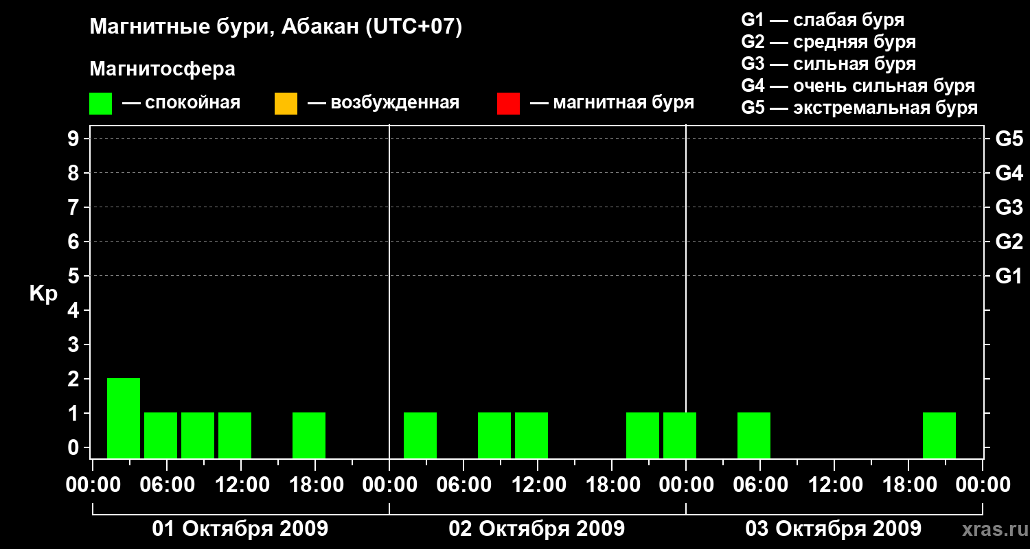 Изменения геомагнитного индекса Kp с 1 по 3 октября 2009 года для средних широт