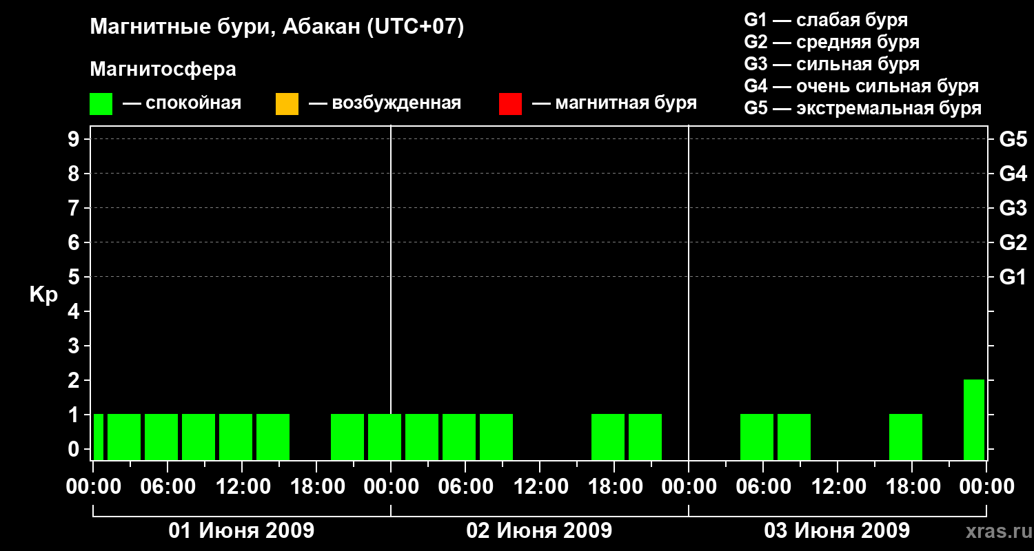 Изменения геомагнитного индекса Kp с 1 по 3 июня 2009 года для средних широт
