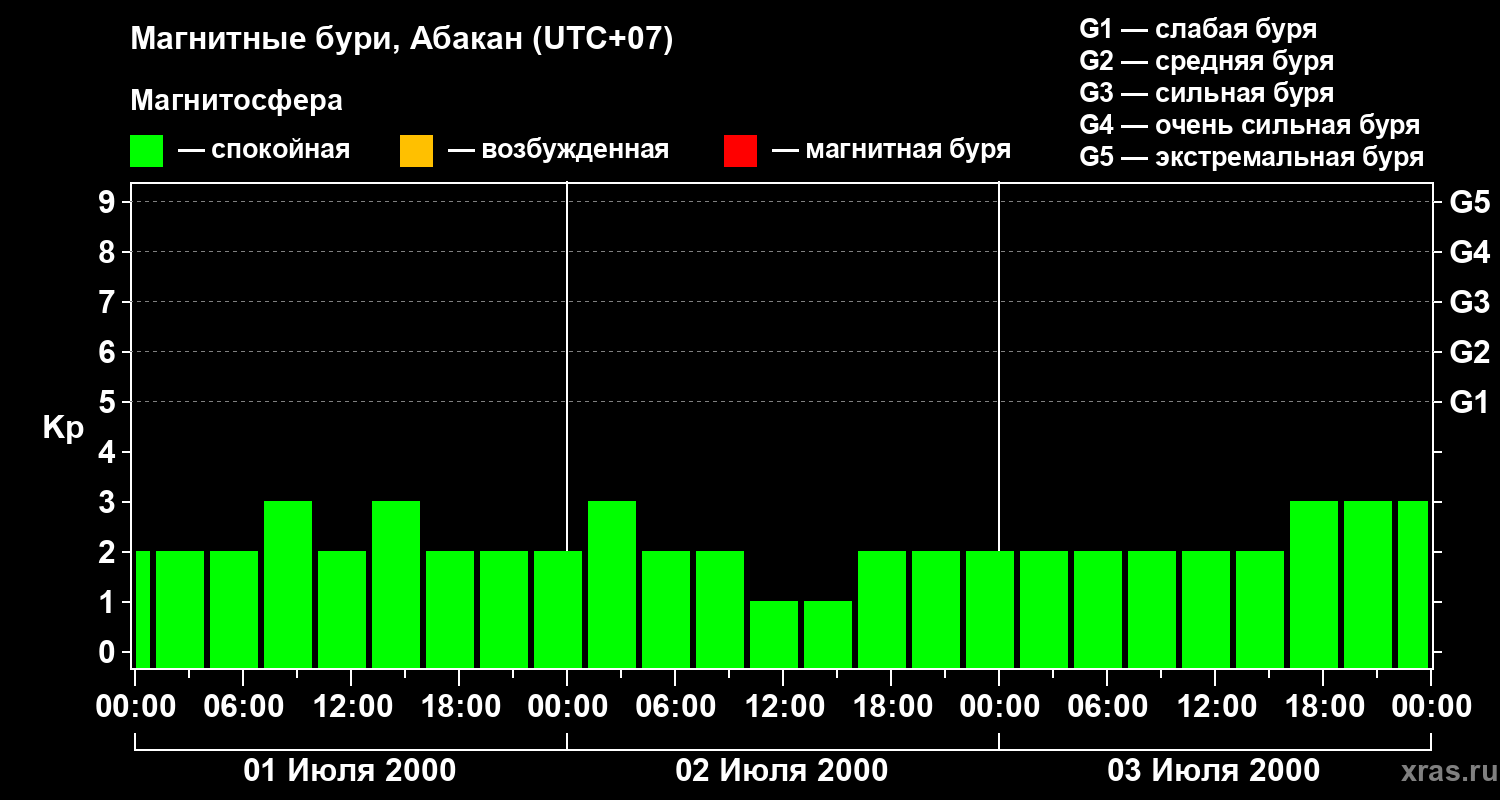 Изменения геомагнитного индекса Kp с 1 по 3 июля 2000 года для средних широт
