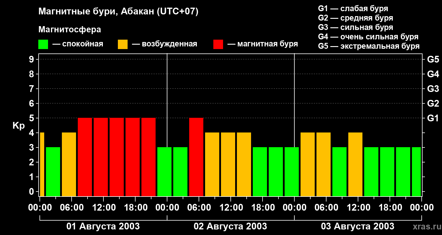 Изменения геомагнитного индекса Kp с 1 по 3 августа 2003 года для средних широт
