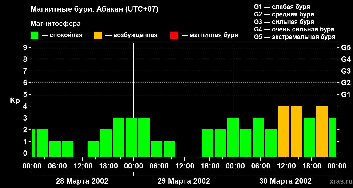 Изменения геомагнитного индекса Kp с 28 по 30 марта 2002 года для средних широт