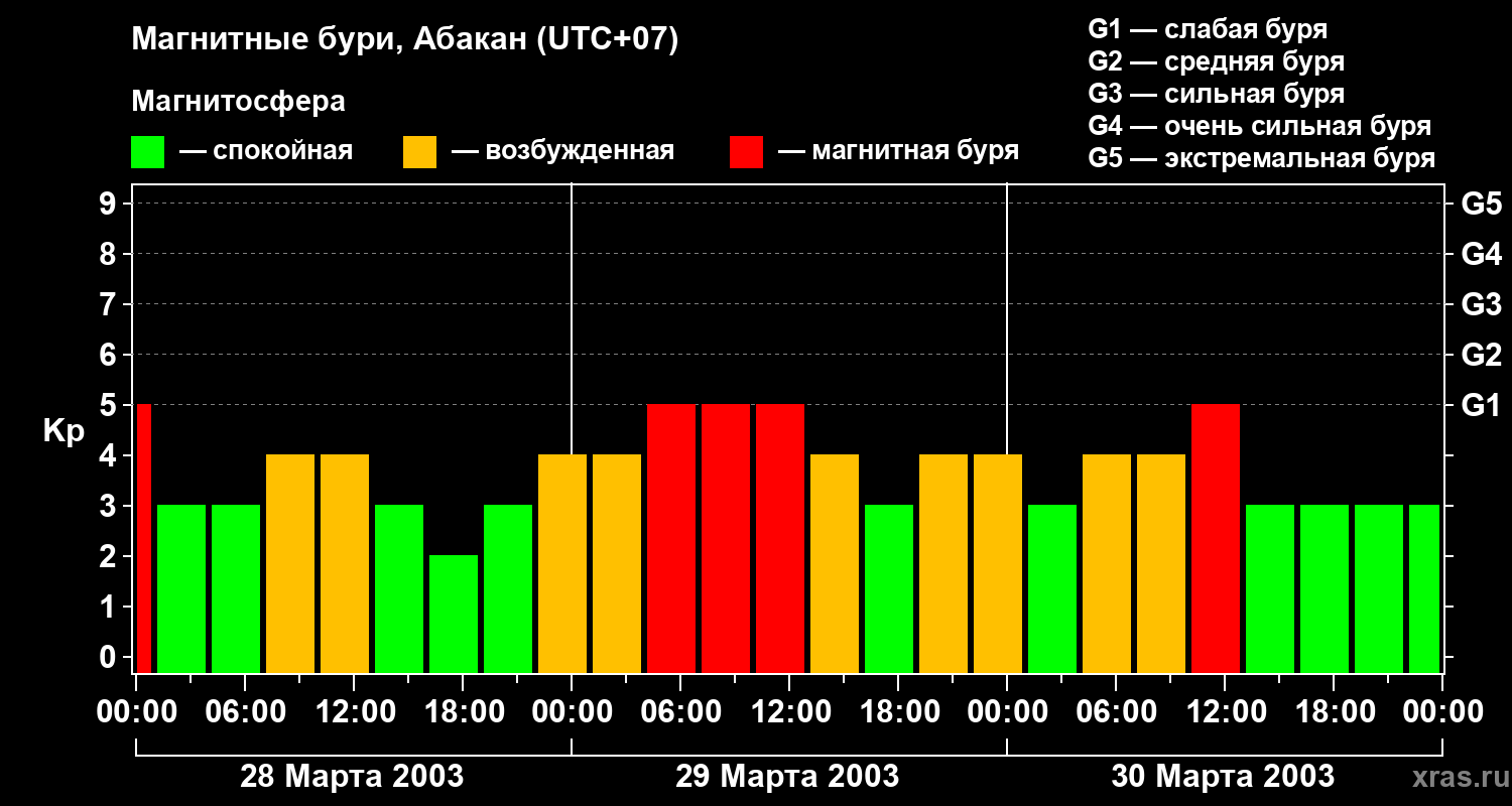 Изменения геомагнитного индекса Kp с 28 по 30 марта 2003 года для средних широт