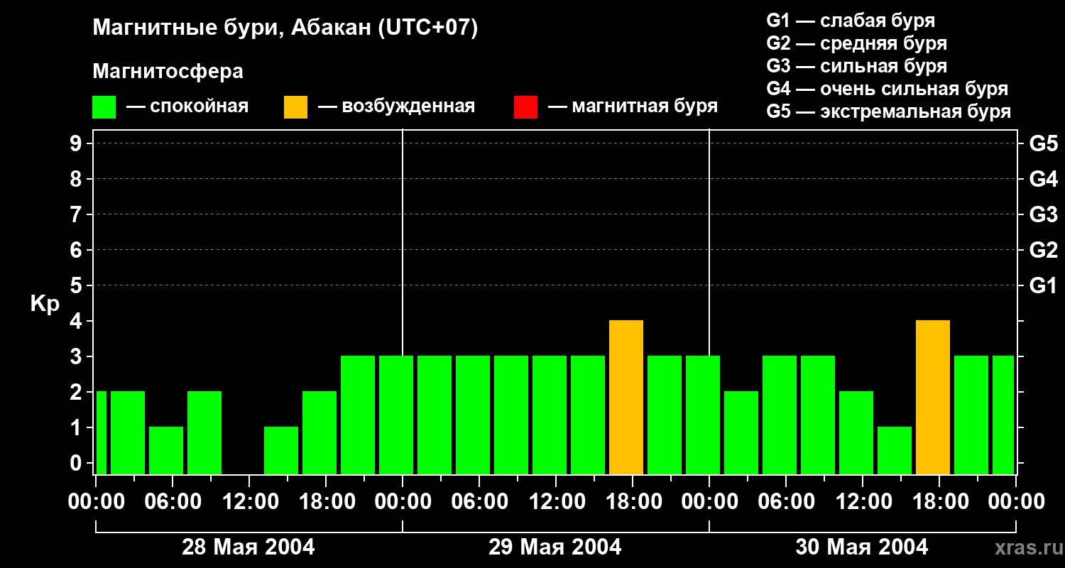 Изменения геомагнитного индекса Kp с 28 по 30 мая 2004 года для средних широт