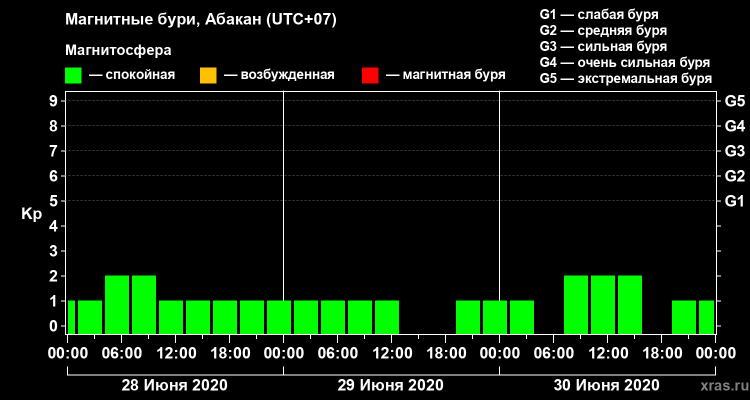 Изменения геомагнитного индекса Kp с 28 по 30 июня 2020 года для средних широт