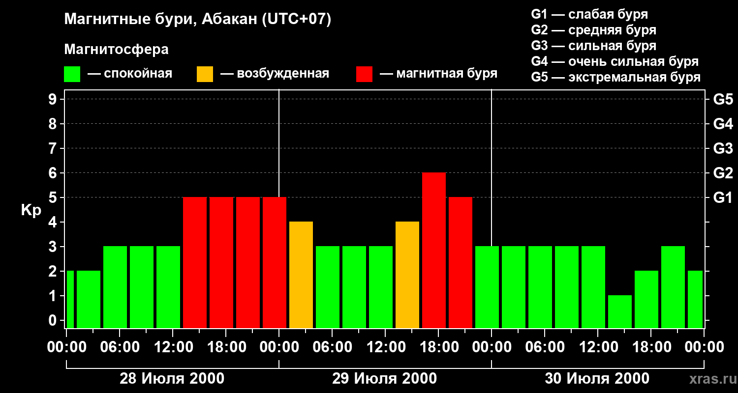 Изменения геомагнитного индекса Kp с 28 по 30 июля 2000 года для средних широт