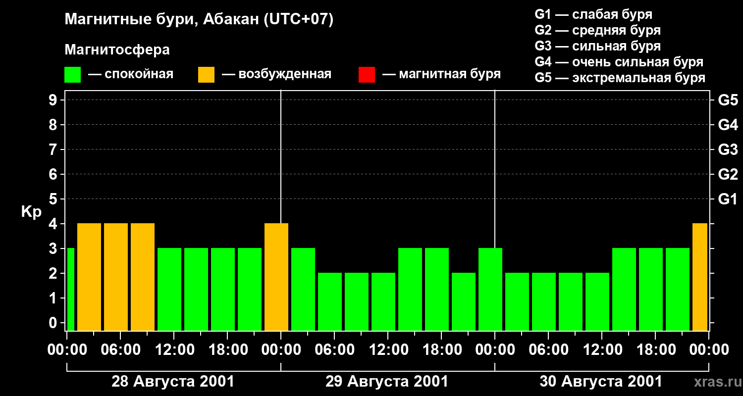 Изменения геомагнитного индекса Kp с 28 по 30 августа 2001 года для средних широт