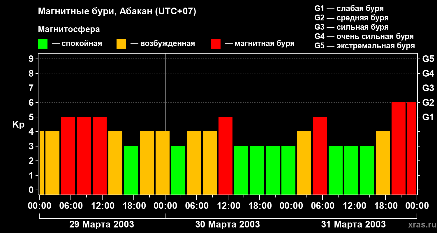 Изменения геомагнитного индекса Kp с 29 по 31 марта 2003 года для средних широт