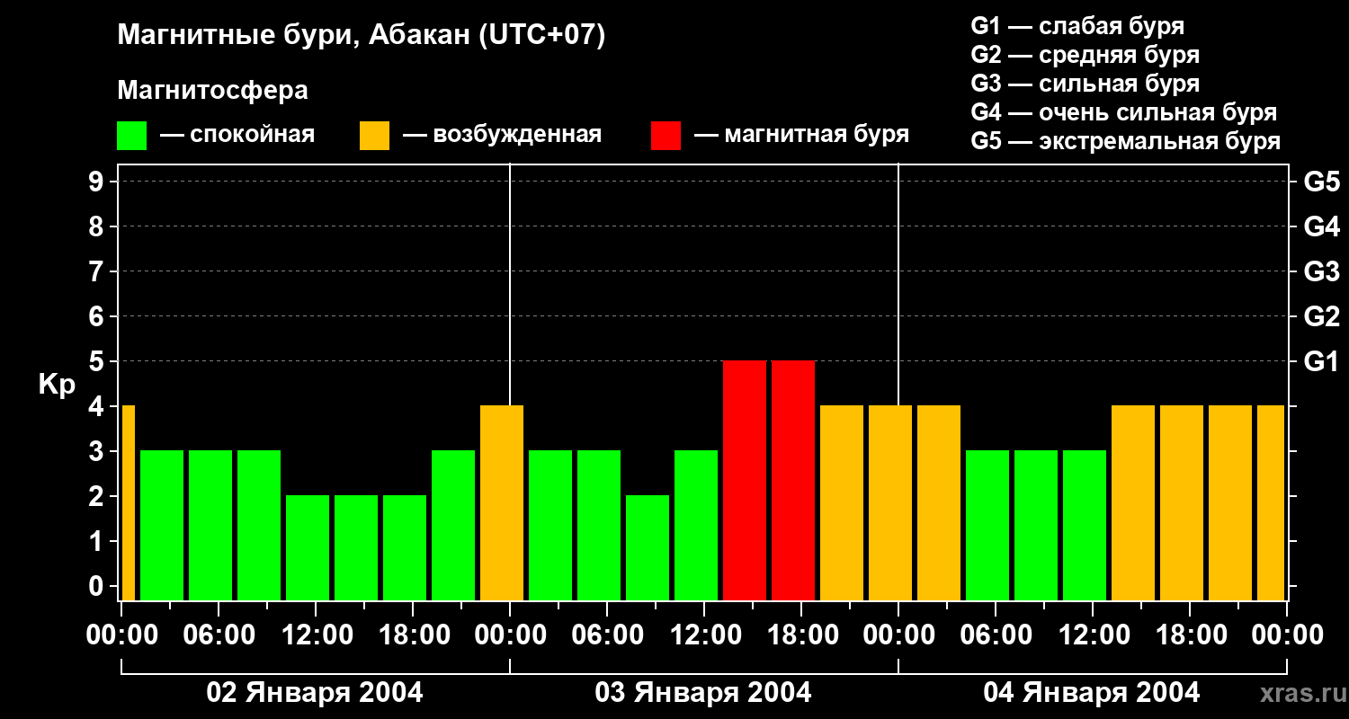 Изменения геомагнитного индекса Kp с 2 по 4 января 2004 года для средних широт