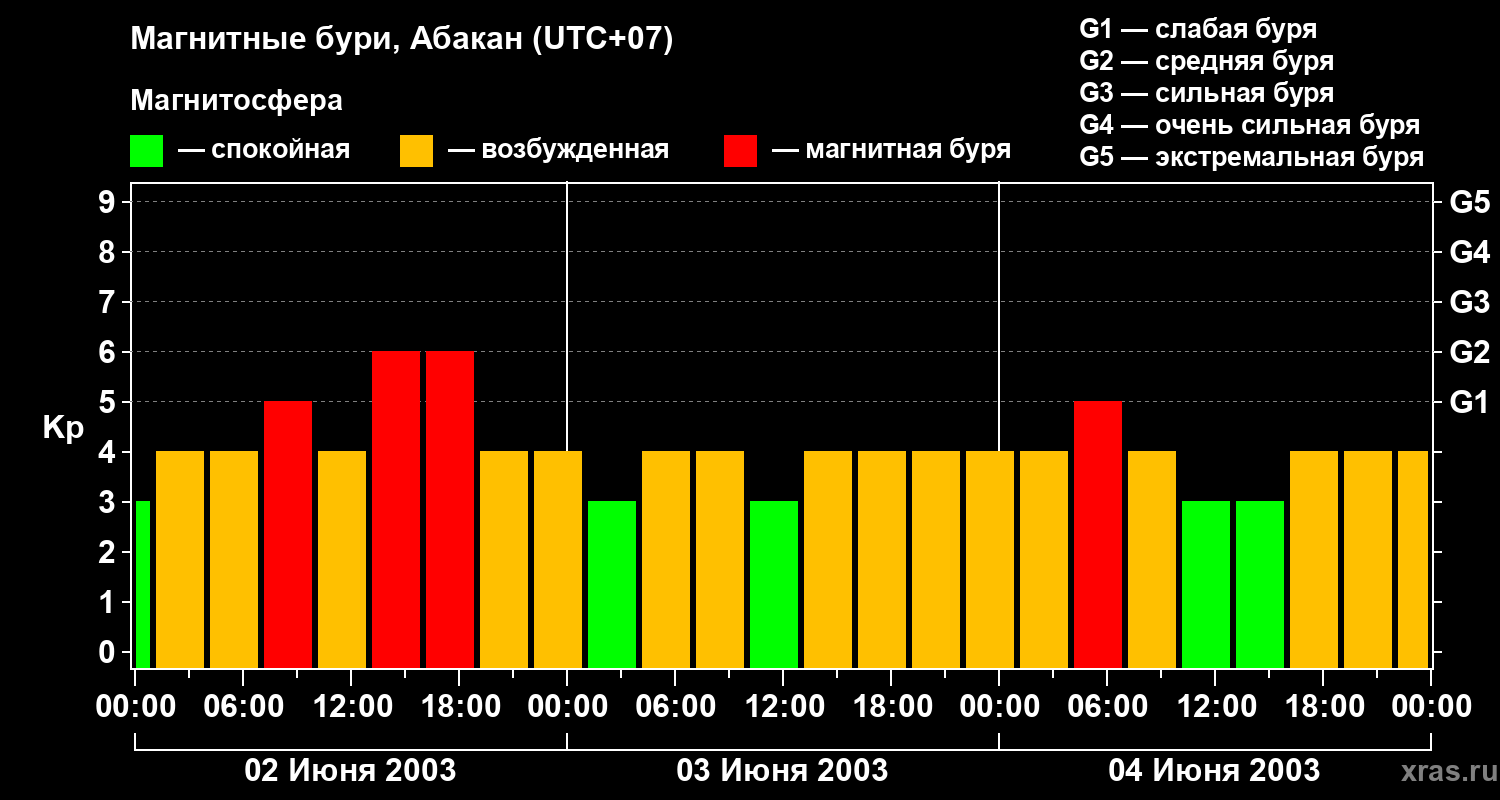 Изменения геомагнитного индекса Kp с 2 по 4 июня 2003 года для средних широт