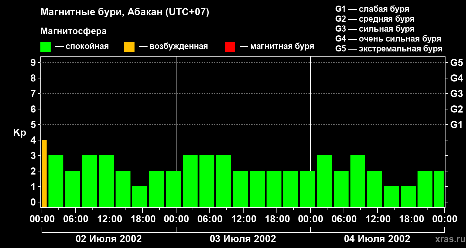 Изменения геомагнитного индекса Kp с 2 по 4 июля 2002 года для средних широт