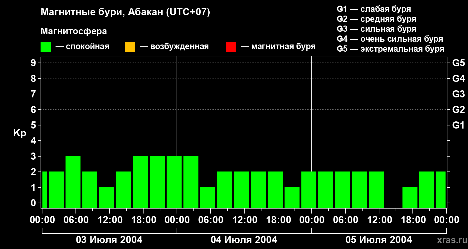 Изменения геомагнитного индекса Kp с 3 по 5 июля 2004 года для средних широт