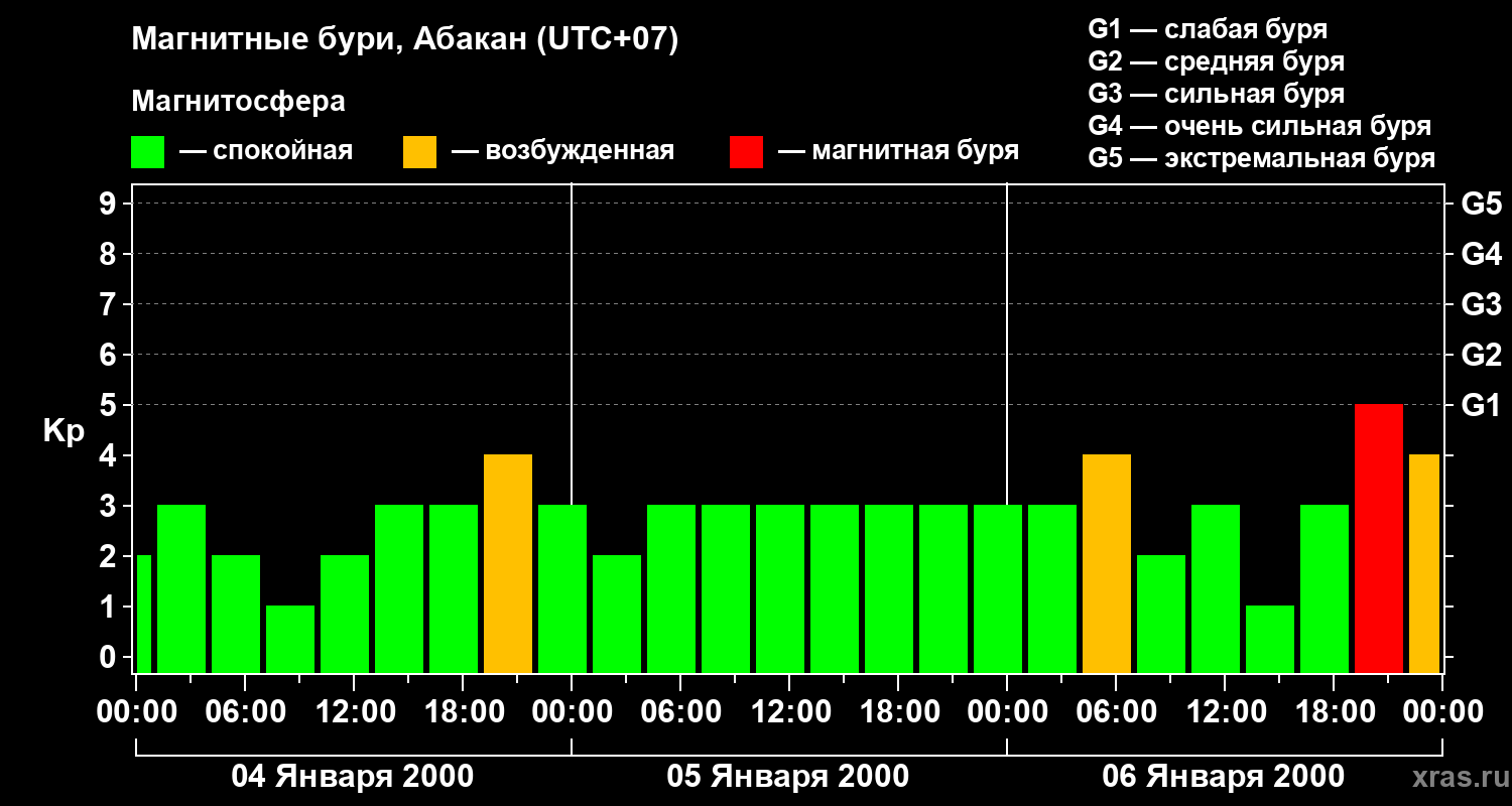 Изменения геомагнитного индекса Kp с 4 по 6 января 2000 года для средних широт
