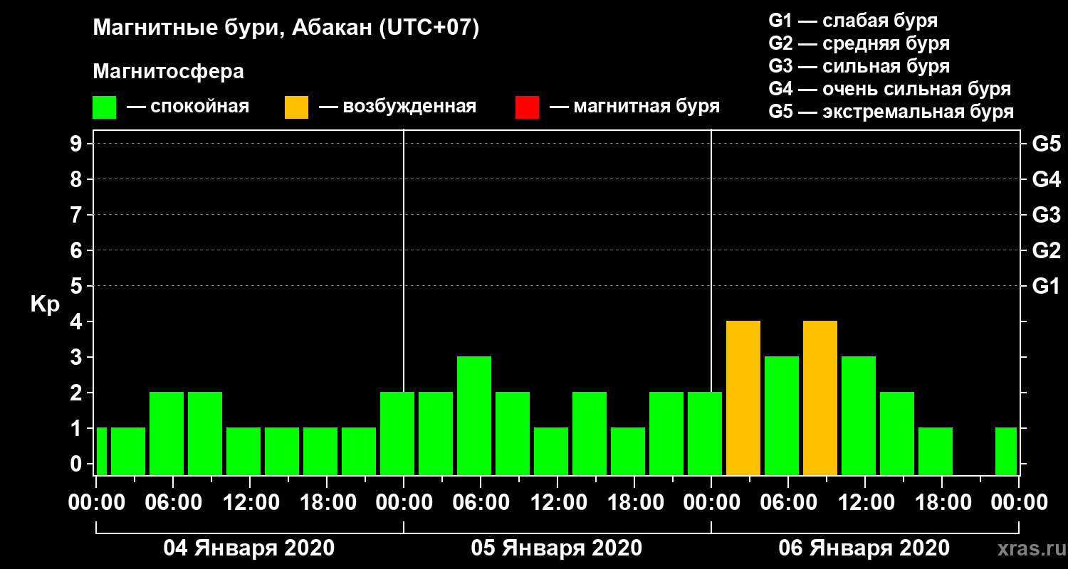 Изменения геомагнитного индекса Kp с 4 по 6 января 2020 года для средних широт