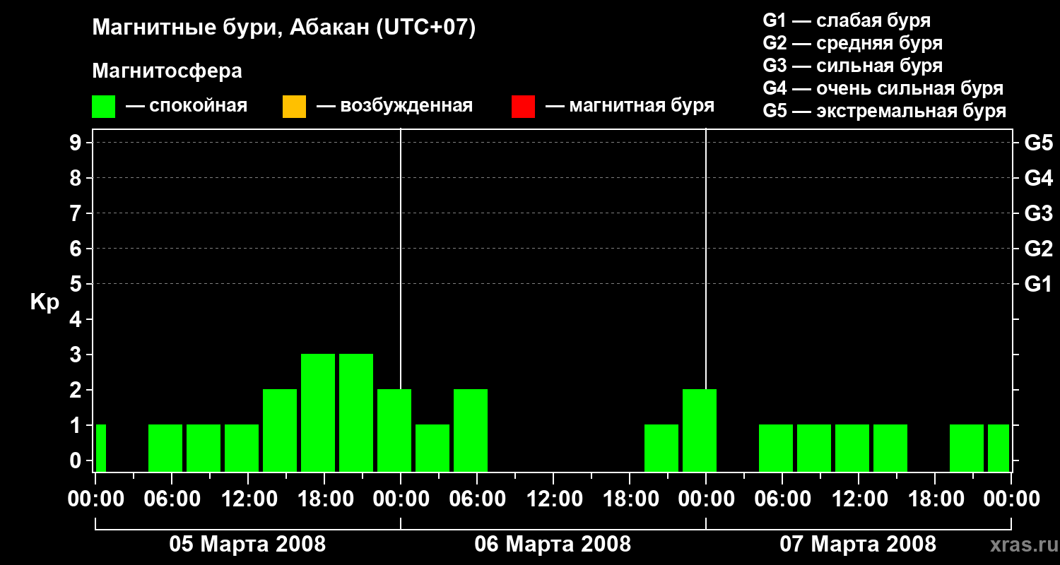 Изменения геомагнитного индекса Kp с 5 по 7 марта 2008 года для средних широт