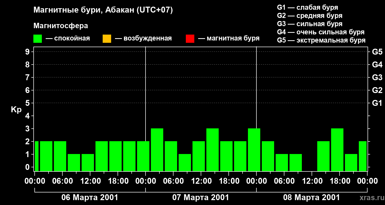 Изменения геомагнитного индекса Kp с 6 по 8 марта 2001 года для средних широт
