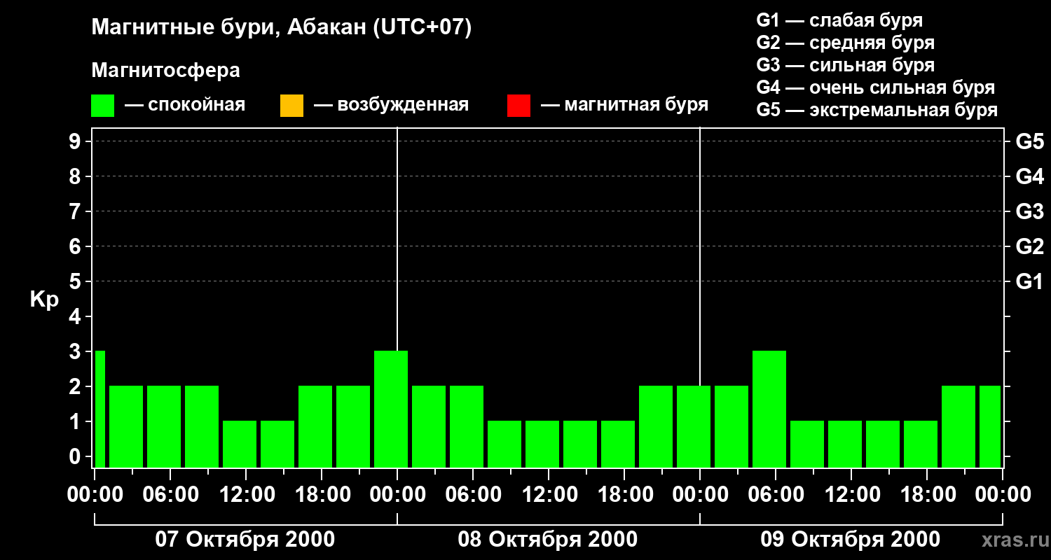 Изменения геомагнитного индекса Kp с 7 по 9 октября 2000 года для средних широт