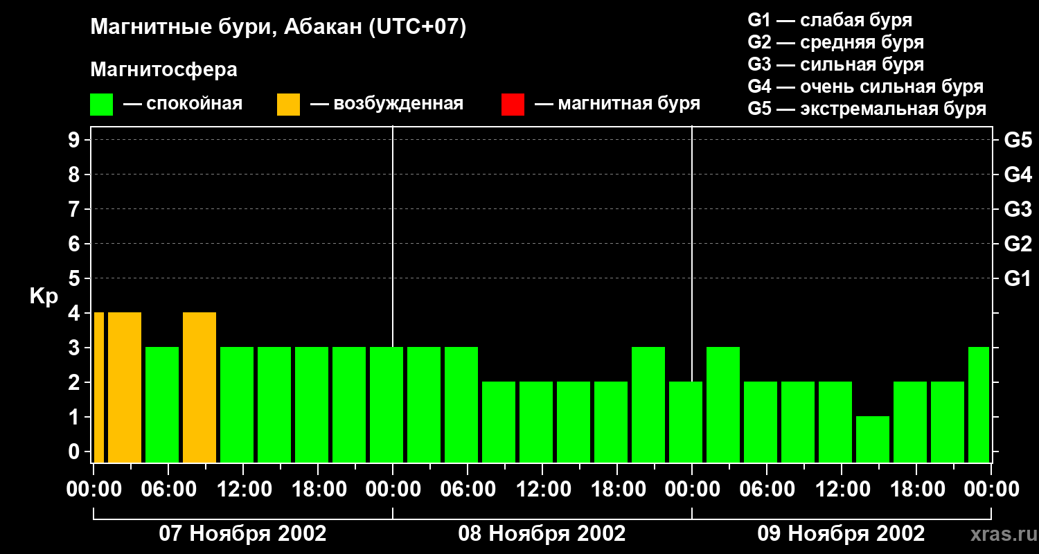 Изменения геомагнитного индекса Kp с 7 по 9 ноября 2002 года для средних широт